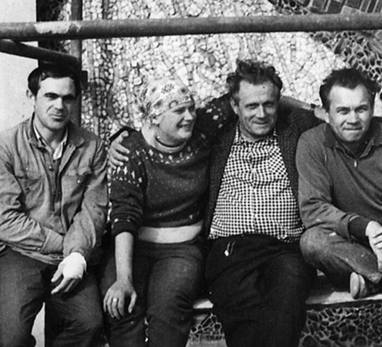 Григорій Пришедько, Алла Горська, Григорій Синиця, Віктор Зарецький на риштуваннях мозаїки. 1965 рік